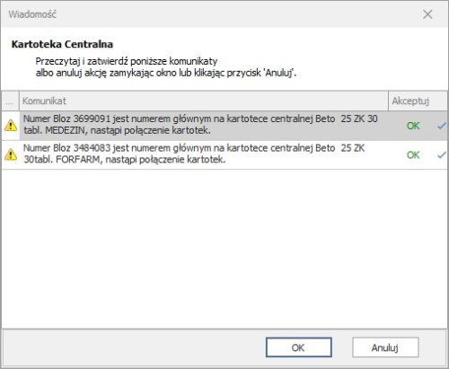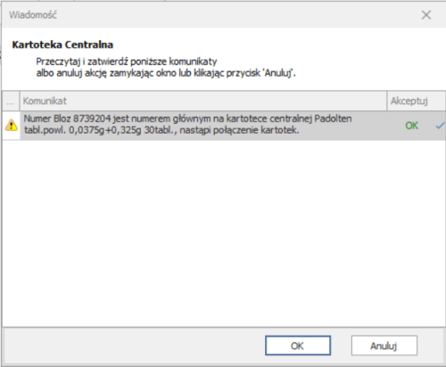 Jeżeli użytkownik naciśnie OK, kartoteka zostanie połączona z zapisywaną kartoteką centralną. Numery alternatywne i numery z nagłówka z dołączanej kartoteki zostaną wpisane w numerach alternatywnych zapisywanej kartoteki centralnej.