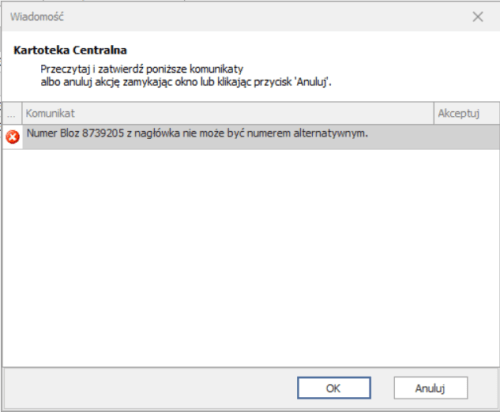 W numeracji alternatywnej nie można podać takiego samego numeru głównego, który jest na nagłówku edytowanej kartoteki centralnej. Pojawi się wówczas przy zapisie komunikat: