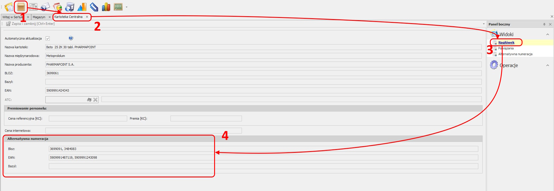 Aby to zrobić należy otworzyć moduł Magazyn-> widok Kartoteki Centralne-> kliknąć operacje Edytuj -> następnie otworzy się widok Nagłówek. To właśnie tutaj w sekcji Alternatywna numeracja możemy podejrzeć, przypisane na karcie numery alternatywne, jest to widok jedynie poglądowy (w tym miejscu nie można edytować alternatywnej numeracji).