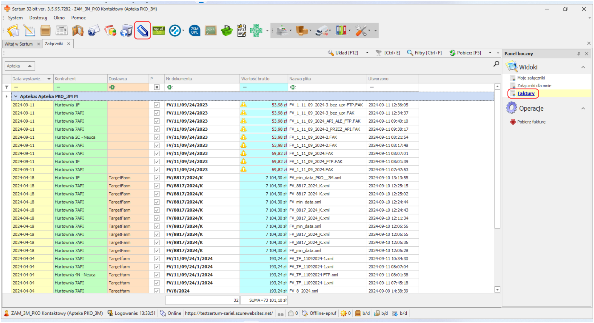 Dodatkowo, od teraz, wszystkie faktury pobierane przez Sertum (z FTP i przez API) będą dostępne, oprócz automatycznego zapisywania faktur we wskazanej lokalizacji (tj. dotychczas), do pobrania w module Załączniki – widok Faktury (przechowywane będą do 60 dni wstecz).