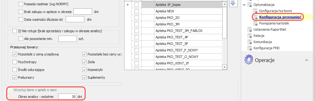 Dodatkowo w widoku Moje apteki została dodana kolumna ze sprzedażą towaru w danej aptece, za okres określony parametrem ustawianym w System -> Konfiguracja -> Konfiguracja przesunięć -> Wczytuj dane z aptek w sieci-Okres analizy – ostatnie {x} dni