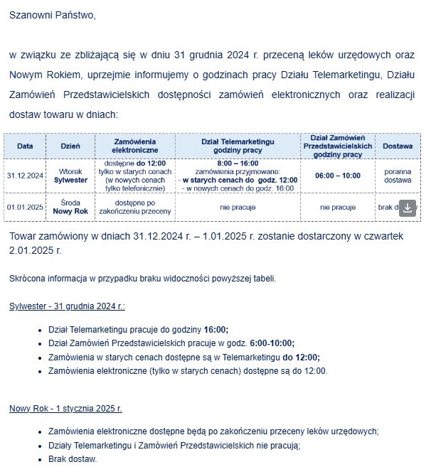 W najbliższy dniach tj. wtorek 31.12.2024 od godziny 12:00 do środy 01.01.2025 hurtownia Farmacol pracuje jak poniżej. W tym okresie nie będzie możliwości składania zamówień w formie elektronicznej ani pobierania faktur.