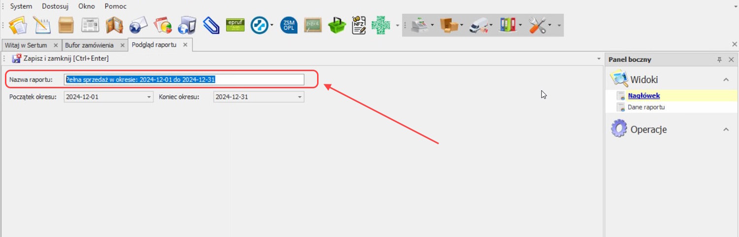 W widoku Nagłówek nazwa raportu ustawia się domyślnie i jest utworzona w oparciu o daty pobierania raportu. Oczywiście nazwę nagłówka można dowolnie zmienić.
