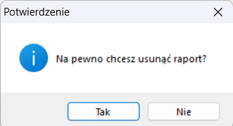 W celu usunięcia raportu należy potwierdzić tą czynność klikając przycisk Tak.