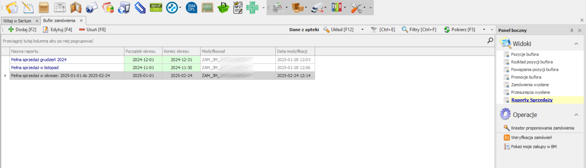 W module Bufor zamówienia, z poziomu loginu zamówieniowego użytkownicy Sertum mają dostęp do Raportu Sprzedaży.