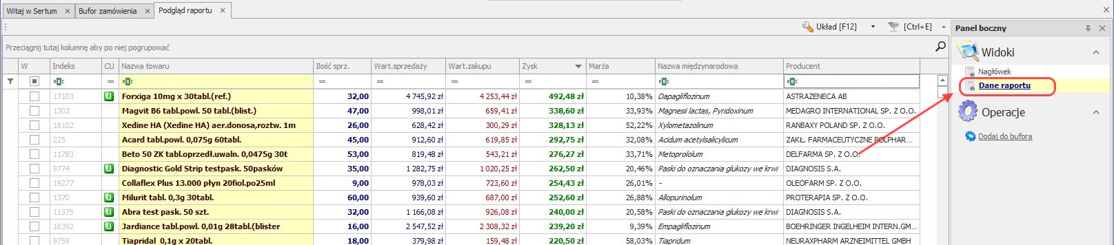 W widoku Dane raportu znajdują się natomiast towary, które zostały sprzedane, w wybranym za pomocą filtrów okresie. A wraz z nimi dane o ilości sprzedaży, wartości, zysku, marży, nazwie międzynarodowej oraz producencie.