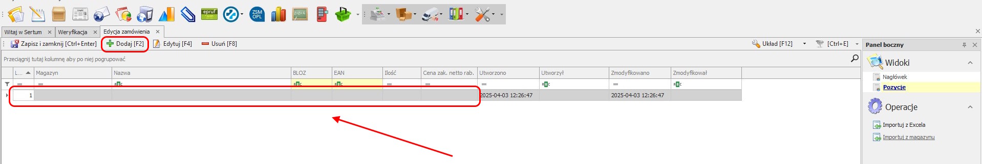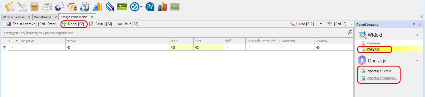 Następnie należy otworzyć widok Pozycje i dodać pozycje do zamówienia.