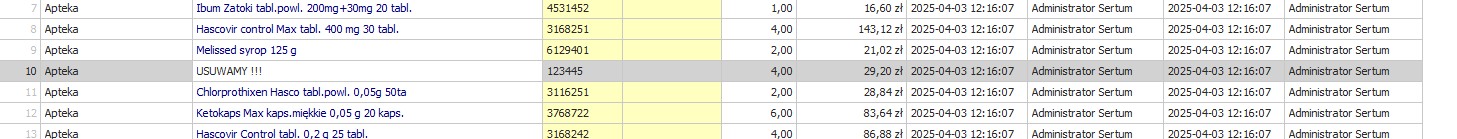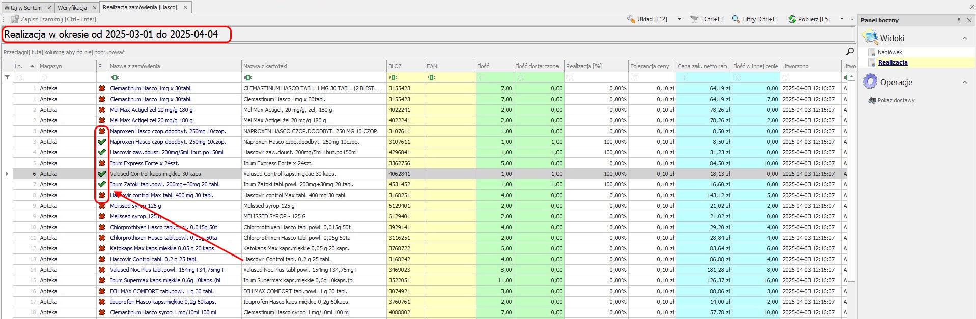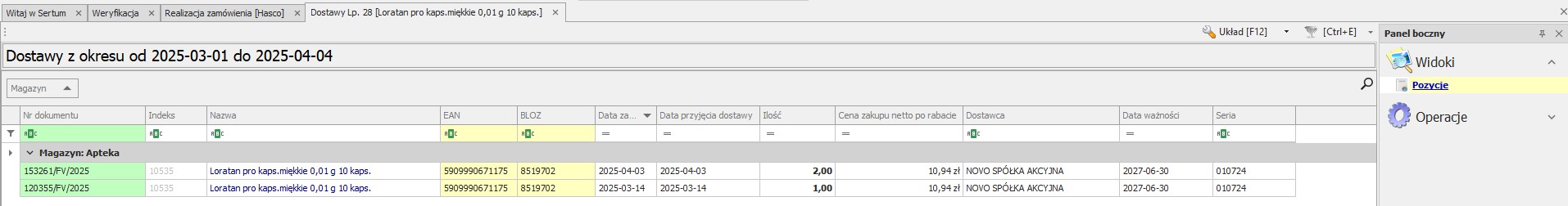 W raporcie możemy za pomocą operacji sprawdzić jakie dostawy były dostarczone do apteki w okresie realizacji zamówienia. W tym celu wystarczy podświetlić taką pozycje na widoku a następnie kliknąć operację