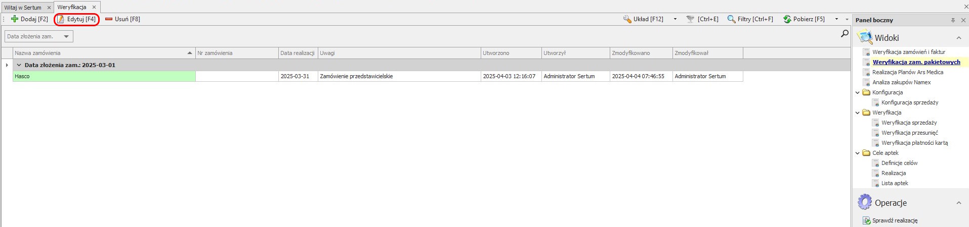 Aby edytować zamówienie należy w widoku Weryfikacja zam. pakietowych podświetlić wybrane zamówienie a następnie kliknąć przycisk