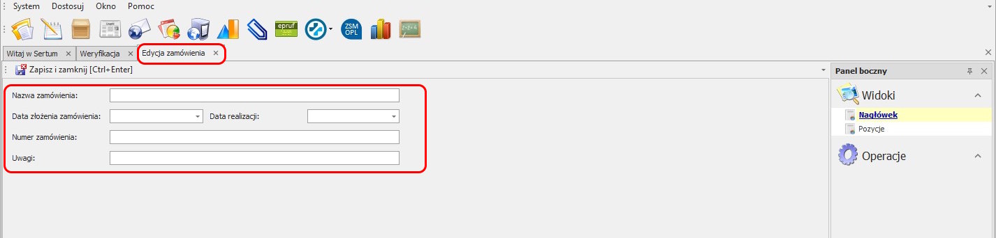 . Następnie otworzy się okno Edycji zamówienia, gdzie należy uzupełnić podstawowe informacje o zamówieniu: