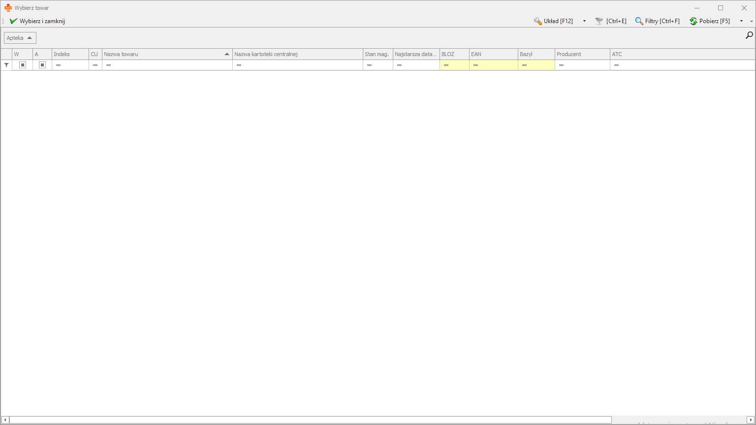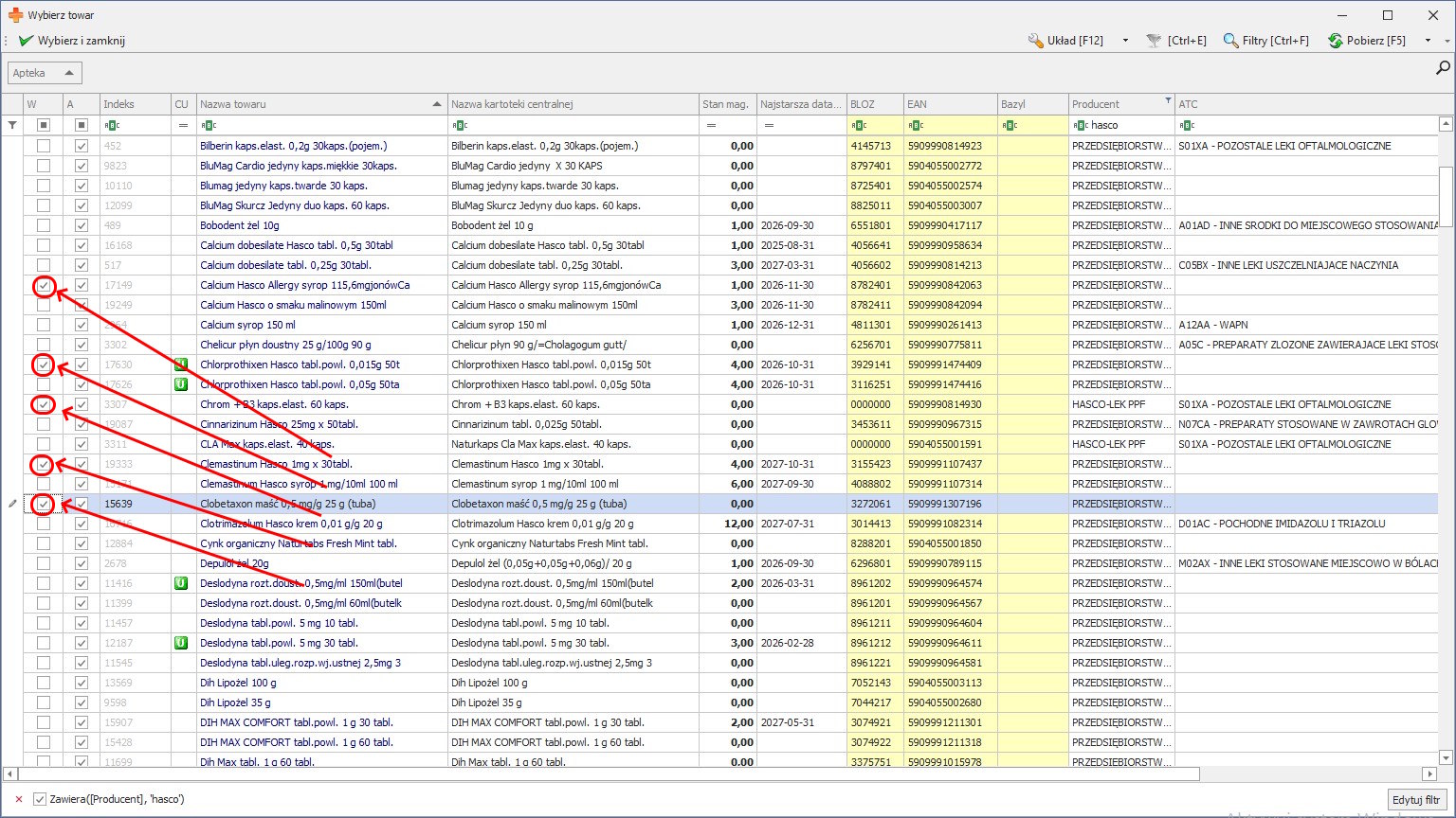 Aby zaznaczyć wszystkie pozycje zawarte w raporcie należy podświetlić jeden towar oraz skorzystać z operacji CTRL+A. Jeżeli chcemy zaznaczyć jedynie wybrane pozycje, możemy zaznaczyć pierwszą i ostatnią kartotekę apteczną z interesującej nas kartoteki centralnej z wciśniętym na klawiaturze przyciskiem SHIFT.