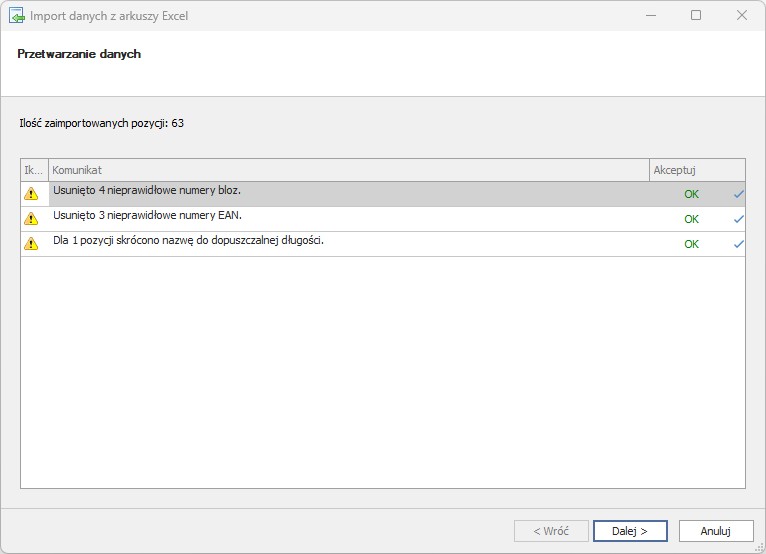 Klikamy przycisk Dalej. Następnie, jeżeli na liście zamówienia pojawią się pozycje, które posiadają nieprawidłowe: numery Bloz, EAN, nieprawidłową nazwę (np.: za długą), cenę lub ilość to pzycyje takie zostaną usunięte z importu. Dodatkowo pojawi się okno Przetwarzanie danych, a w nim informacja w formie komunikatu: