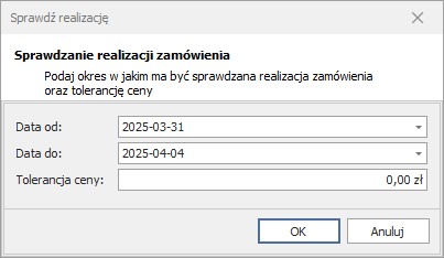 Otworzy się okno Sprawdź realizacje. Jeżeli na zamówieniu podano datę realizacji zostanie ona ustawiona w polu Data od, jeżeli jej nie podano pole to należy uzupełnić. Pole Data do uzupełnione jest domyślnie datą bieżącą.