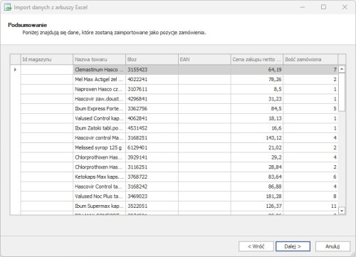 2. Dodawanie pozycji zamówień za pomocą operacji Importuj z Excela.