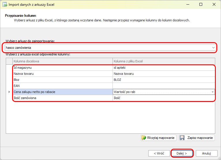 Kreator otworzy kolejne okno, Przypisanie kolumn, za pomocą którego należy wskazać arkusz zawierający dane o zamówieniu. W tym celu za pomocą strzałki w Wybierz arkusz do zaimportowania wskazujemy nazwę arkusza, a następnie w Kolumnie z plikiem Excel kojarzymy kolumny.