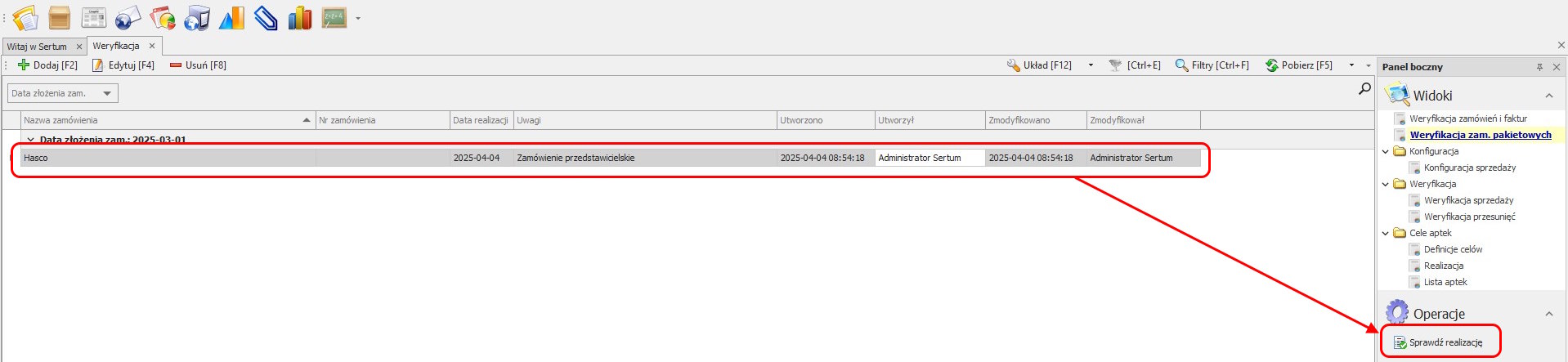 Aby sprawdzić realizacje zamówienia, należy wejść w moduł Weryfikacja -> widok Weryfikacja zam. pakietowych i następnie kliknąć przycisk