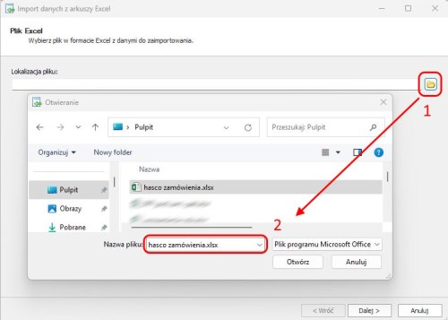 otwiera się okno Import danych z arkuszy Excel. W oknie należy wskazać plik Excel.