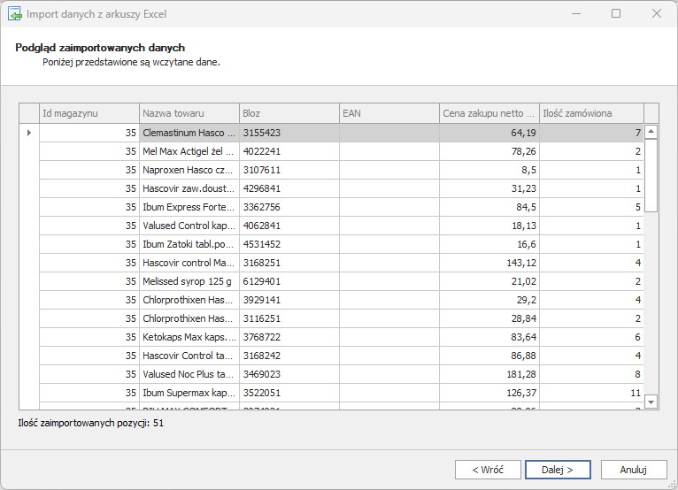 Po zakończonym imporcie, w widoku Pozycje pojawią się zaczytana lista produktów.