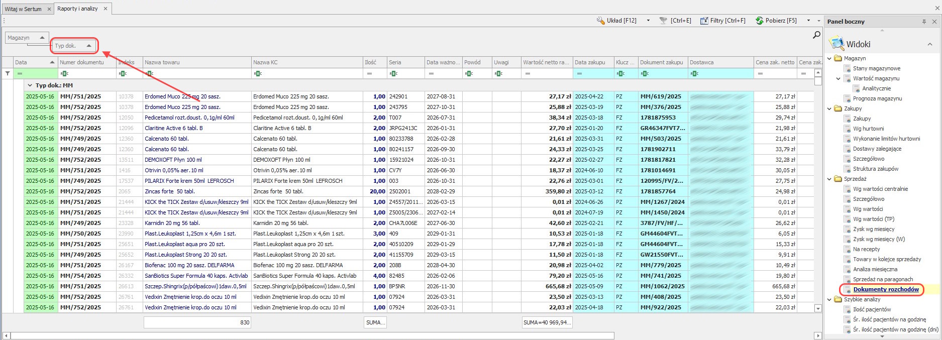 Po pobraniu raportu widok domyślnie zostaje pogrupowany po typie dokumentu.