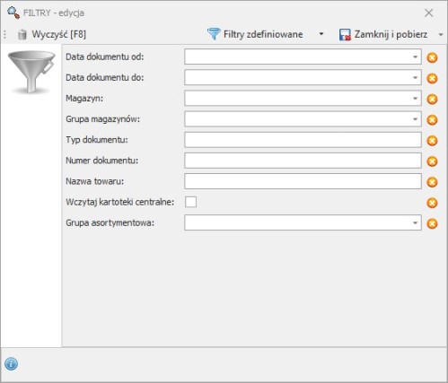 Aby pobrać raport należy kliknąć Filtry [Ctrl+F]. Następnie uzupełnić przynajmniej filtry Data dokumentu od oraz Data dokumentu do na okres maksymalnie 7 dni.