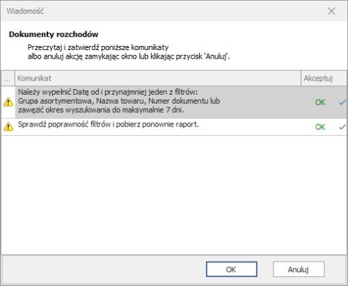 Jeżeli w raporcie nie wskażemy odpowiednich filtrów, przy próbie pobrania raportu otrzymamy poniższą informacje:
