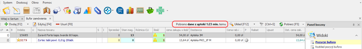 - Dodaliśmy licznik odmierzający czas od ostatniego odświeżenia danych w buforze optymalizacji. Dane odświeżane są podczas optymalizacji (w zależności od czasu ustawionego w konfiguracji w opcji Odświeżaj dane przy optymalizacji co) lub po kliknięciu Pobierz.