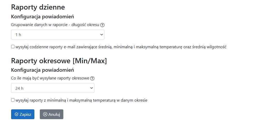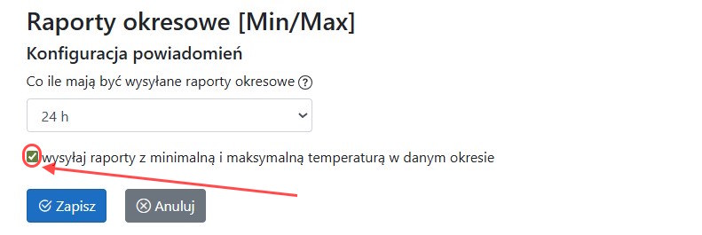 Aby włączyć raporty okresowe należy zaznaczyć za pomocą checkboxa opcje: Wysyłaj raporty z minimalną i maksymalną temperaturą w danym okresie, tak jak na poniższym obrazku: