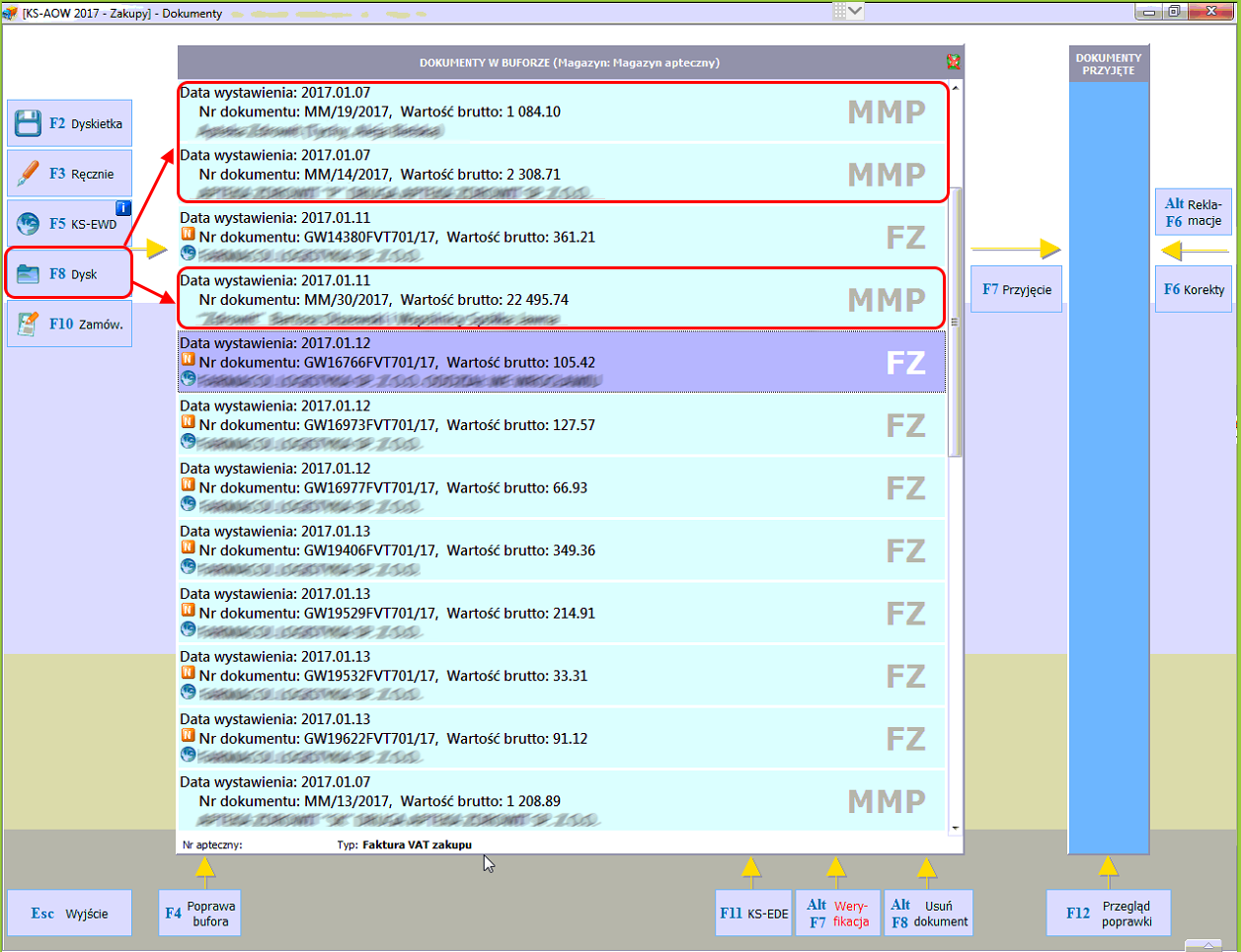 Wtedy w celu wczytania wygenerowanego przesunięcia (MM+) należy wejść w moduł 13 Zakupy -> 1 Dokumenty -> F8 Dysk.