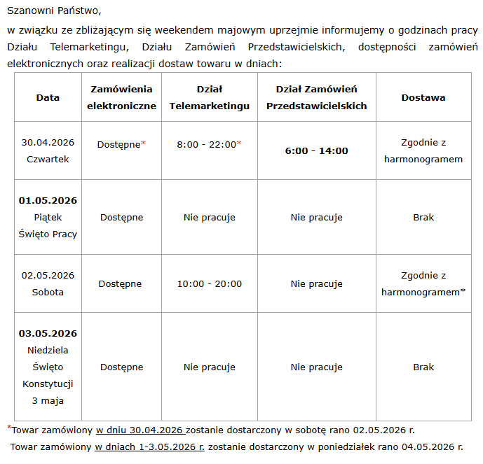 Poniżej treść informacji o pracy hurtowi w tym okresie: