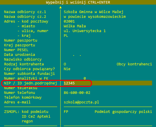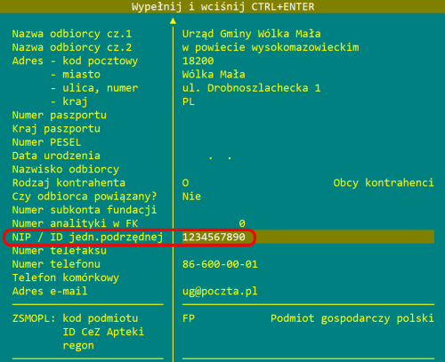 Aby wystawić taką fakturę VAT należy utworzyć w funkcji Słowniki > Odbiorcy leków z apteki dwa podmioty. Pierwszy dla Jednostki Samorządu Terytorialnego z wypełnionym 10-cyfrowym NIPem: