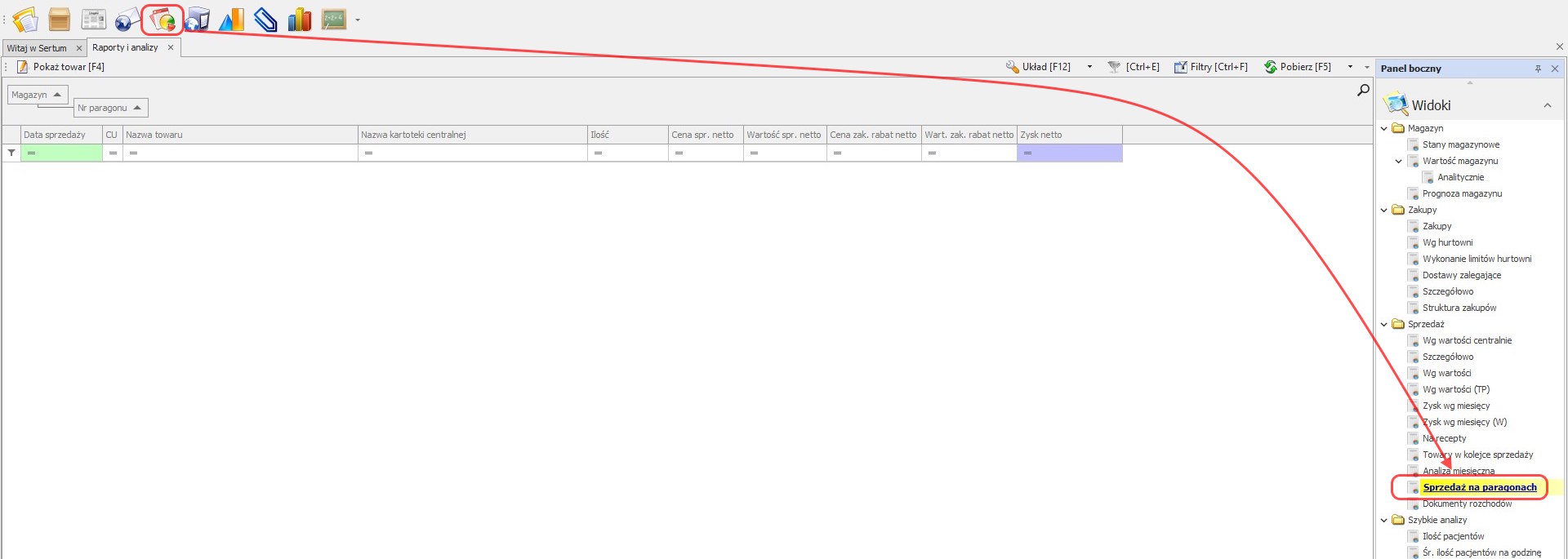 Raport Sprzedaż na paragonach znajduje się w module Raporty i analizy. Raport pozwala wyszukać wszystkie paragony w zadanym przedziale czasu dla wybranego leku. Jesteśmy w stanie sprawdzić, czy pacjent oprócz wyszukiwanego leku dokonuje zakupu również innych preparatów. Możemy również zweryfikować jaki zysk na paragonie przyniosła sprzedaż preparatów z obniżoną (promocyjną) ceną, co daje większą kontrolę nad ustaloną polityką cenową.