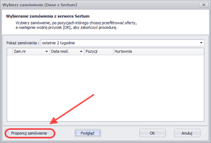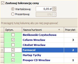Aby skojarzyć zamawiany towar z jedną z propozycji Sertum, wystarczy dwukrotnie kliknąć na wybranej pozycji. Wtedy w kolumnie „Z” pojawi się ciemnozielona ikonka. Jeżeli natomiast chcemy skojarzyć z towarem niezaproponowanym przez Sertum, musimy wskazać nazwę hurtowni, a następnie kliknąć przycisk Dodaj znajdujący się górnej części okna. Spowoduje to wyświetlenie pełnej oferty hurtowni i umożliwi wybranie dowolnego towaru, który zostanie automatycznie skojarzony z zamawianym lekiem.