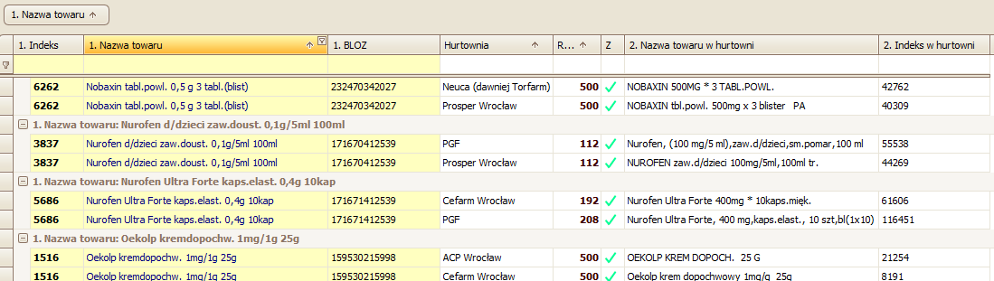 W pierwszej kolejności program sprawdza, czy dany towar nie został już skojarzony przez nas wcześniej. Jeżeli nie, to przeszukuje oferty hurtowni pod kątem zgodności numerów BLOZ i BAZYL. Wystarczy, aby szukany numer zgadzał się w jednej z hurtowni, ponieważ Sertum zna powiązania większości towarów między hurtowniami.
