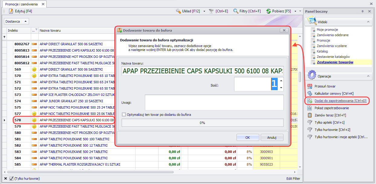 Przed przystąpieniem do kojarzenia leków, musimy w pierwszej kolejności wczytać nasze zamówienia przygotowane w programie aptecznym. W tym celu należy użyć operacji Wczytaj zamówienie i wybrać interesujące nas zamówienie.