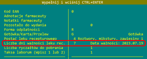 W funkcjach Rozchody > Wydawanie leków przy okienku > Ekspedycja leków > Recepta złożona oraz Rozchody > Wydawanie leków przy okienku > Ekspedycja leków > Wydanie leku złożonego dodano parametr Liczba dni ważności leku recepturowego.