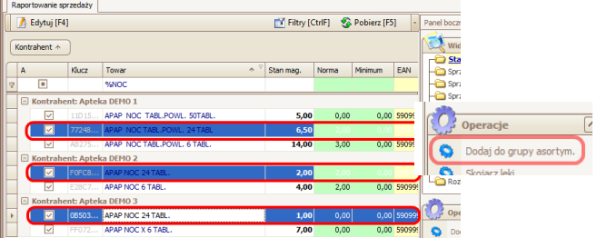 Teraz pokażemy jak stworzyć grupę, która zawiera leki bez ceny urzędowej. Na początku wyszukujemy w dowolnym raporcie: stany magazynowe, zakupy, sprzedaż wg wartości,sprzedaż wg wartości centralnie, sprzedaż szczegółowo towar, na przykład po nazwie producenta, korzystając z filtrów.