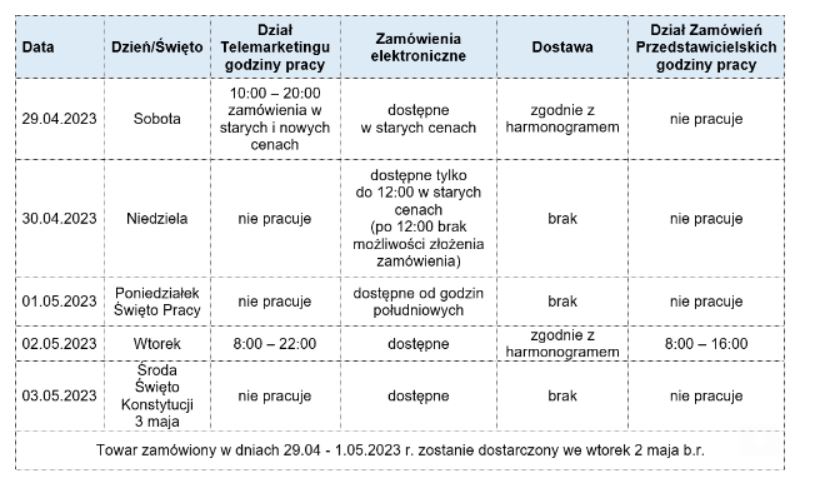 Od godziny 12:00 dnia 30 kwietnia 2023 (niedziela) do dnia 1 maja 2023 (poniedziałek) – godzin południowych, nie będzie możliwości składania zamówień w formie elektronicznej, czyli również zamówień wysyłanych na konto FTP.