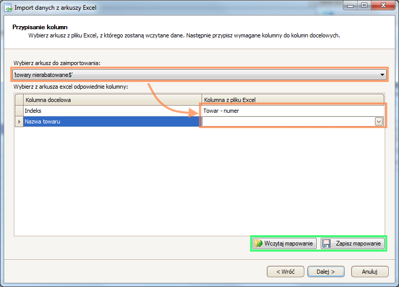 Kolejnym ekranem jest ekran przypisania kolumn. Należy w nim wybrać arkusz, z którego będą pobierane dane oraz przypisać danym odpowiednie kolumny. Kolumna „Indeks” jest oznacza indeks towaru w hurtowni. Kolumna „Nazwa towaru” jest opcjonalna i nie wpływa na sam proces importu. Warto zwrócić uwagę na przyciski „Wczytaj mapowanie” i „Zapisz mapowanie”, które pozwalają zapisać oraz wczytać wybrane mapowanie kolumn (ale nie wybranie arkusza) .