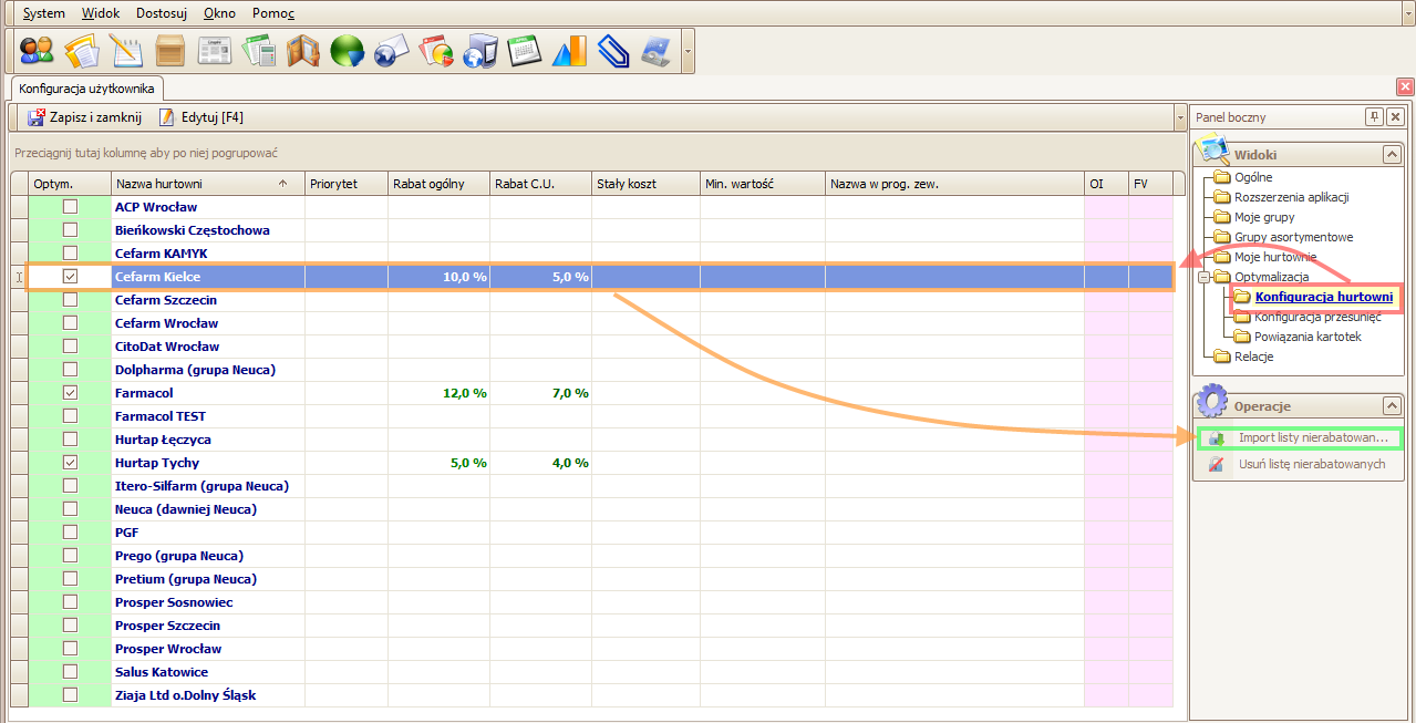 Operacja jest dostępna z modułu „Konfiguracja” w widoku „Konfiguracja hurtowni”. Aby uruchomić import, należy wybrać hurtownię, której towary chcemy zaktualizować , a następnie przycisnąć operację „Import listy nierabatowanych”.