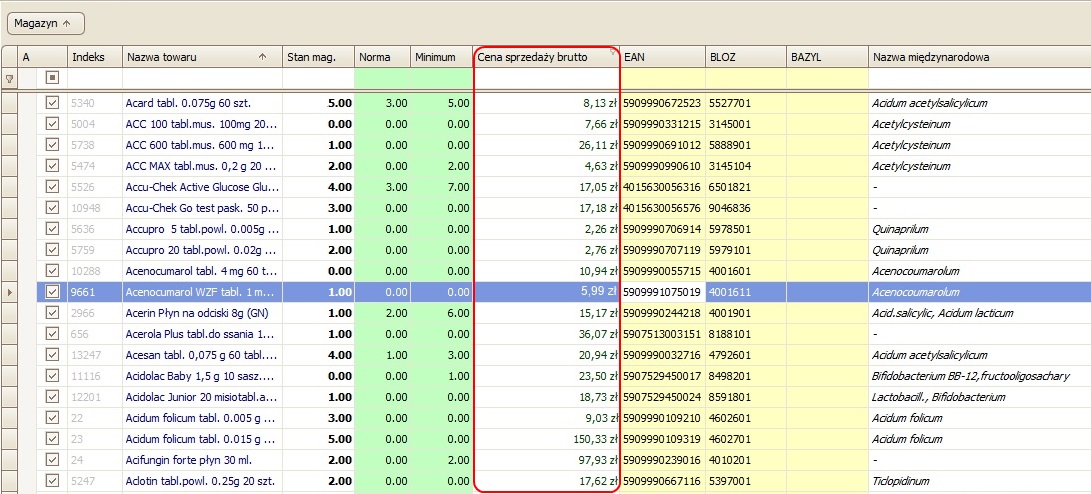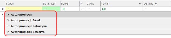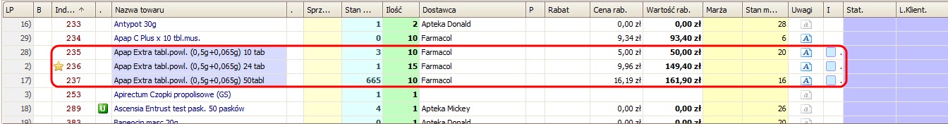 – tło pozycji (zawartość komórek w kolumnie Nazwa towaru), do których kartotek został dodany komunikat zmieni się na kolor