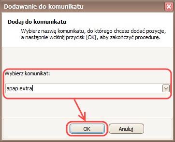 otwiera się okno, w którym należy wpisać tytuł nowego komunikatu – np. „apap noc” lub wybrać z listy już istniejących komunikatów.