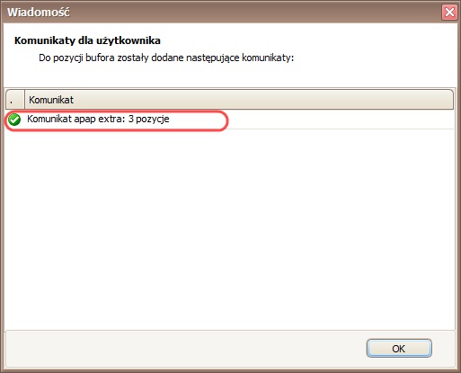W przypadku dodania towaru do już istniejącego komunikatu, po przyciśnięciu przycisku OK zostanie wyświetlone okno z informacją: