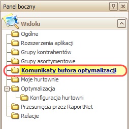 W Konfiguracji użytkownika dodano również widok Komunikaty bufora optymalizacji, służący do zarządzania komunikatami (System -> Konfiguracja -> widok Komunikaty bufora optymalizacji).