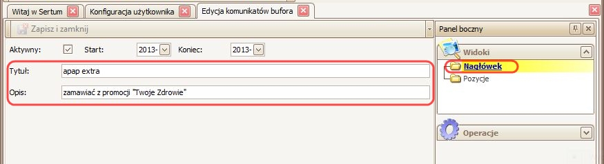 W widoku Nagłówek, w polu Tytuł, wyświetli się wpisany (bądź wybrany wcześniej tytuł komunikatu) – można go edytować, jak również można dodać poniżej treść komunikatu w polu Opis.