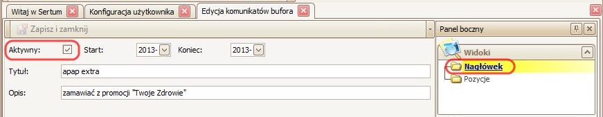 Na koniec należy kliknąć Zapisz i zamknij na pasku akcji u góry okna. Dodane w ten sposób komunikaty będą widoczne dla aptek przy pozycjach w Buforze zamówienia.