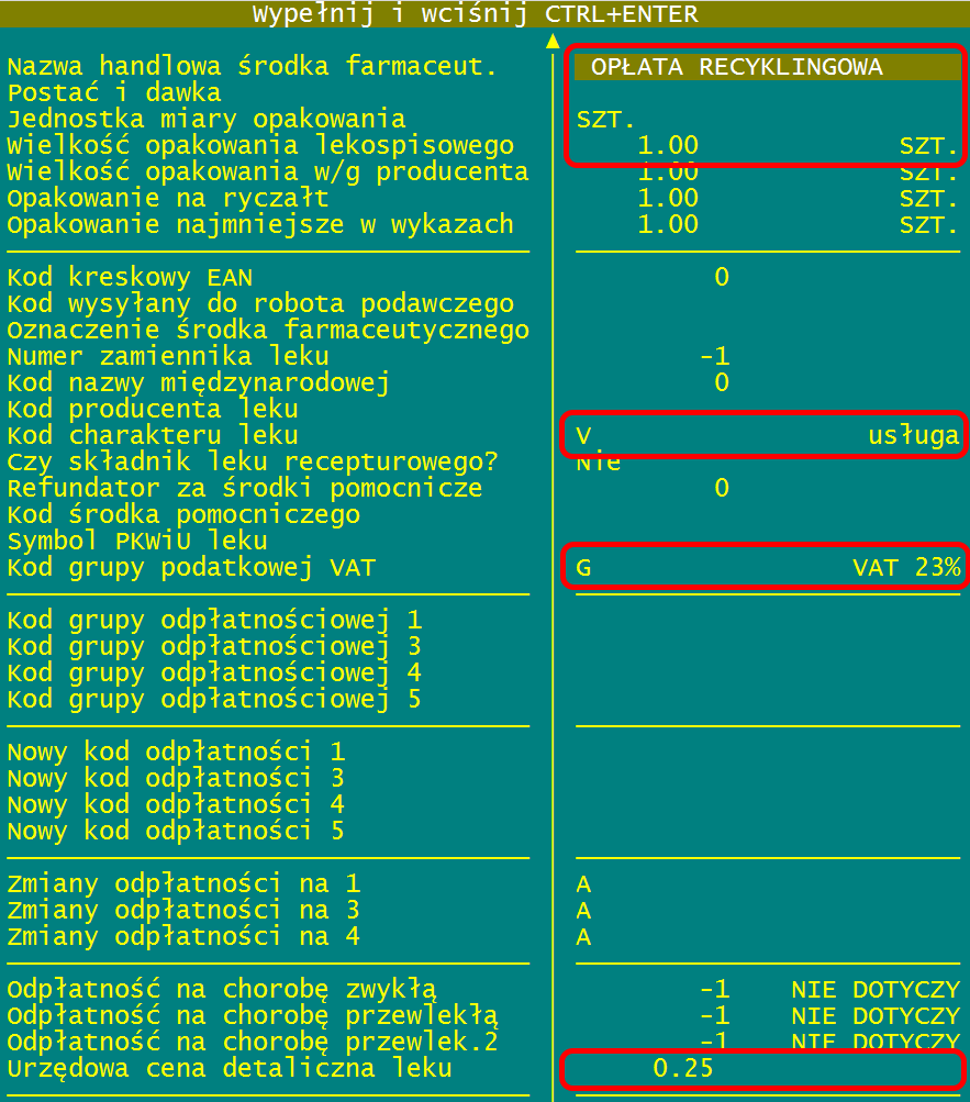 Aby umożliwić pobieranie od pacjenta opłaty recyklingowej, należy dodać do Asortymentu Apteki nową kartę o następującej zawartości: