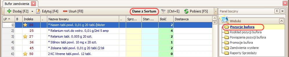 Należy otworzyć moduł Zamówienia (Bufor zamówienia) na dowolnym widoku (w przykładzie poniżej – widok Pozycje bufora). Jeśli na pasku akcji w prawym górnym rogu okna znajduje się napis „Dane z apteki” oznacza to, że aktualnie pobierane są dane z programu aptecznego.