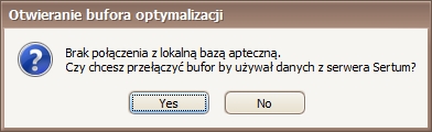Powyższy komunikat może pojawić się także w sytuacji, gdy użytkownik przebywa w aptece, lecz program Sertum nie jest skonfigurowany z apteczną bazą danych lub baza ta nie odpowiada.