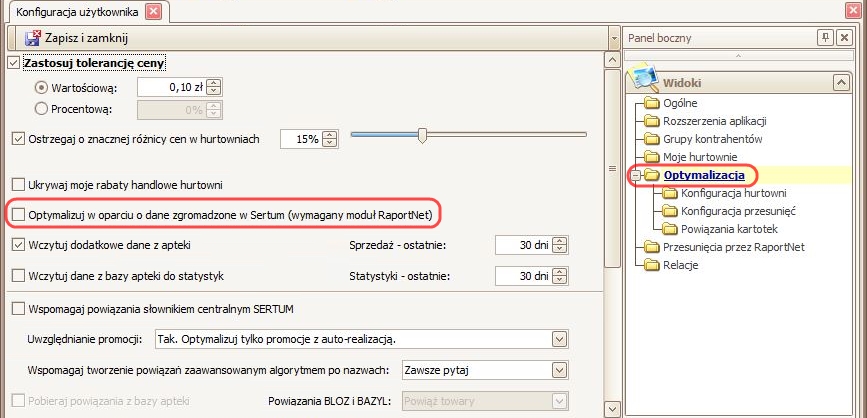 Znajduje się tutaj parametr „Optymalizuj w oparciu o dane zgromadzone w Sertum (wymagany moduł RaportNet)” – jego zaznaczenie spowoduje zaczytywanie danych z serwera Sertum, zamiast z programu aptecznego, co umożliwi zoptymalizowanie i wysłanie zamówienia znajdując się w domu (poza apteką).