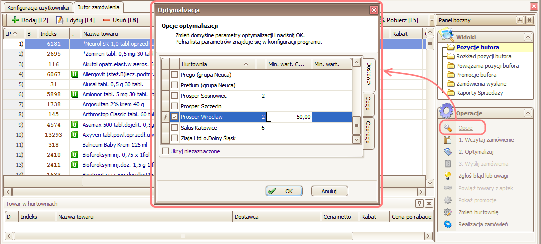 . Pojawi się komunikat pytający, czy usunąć wybrane wiersze z bufora zapotrzebowania. Po wybraniu „Tak” dodane towary zostaną usunięte z bufora zapotrzebowania. Jeżeli wybierzemy „Nie”, dodane wiersze pozostaną w buforze zapotrzebowania. W ten sposób można zapisać towary często zamawiane przez pacjentów i w łatwy sposób dodawać je do bufora optymalizacji.